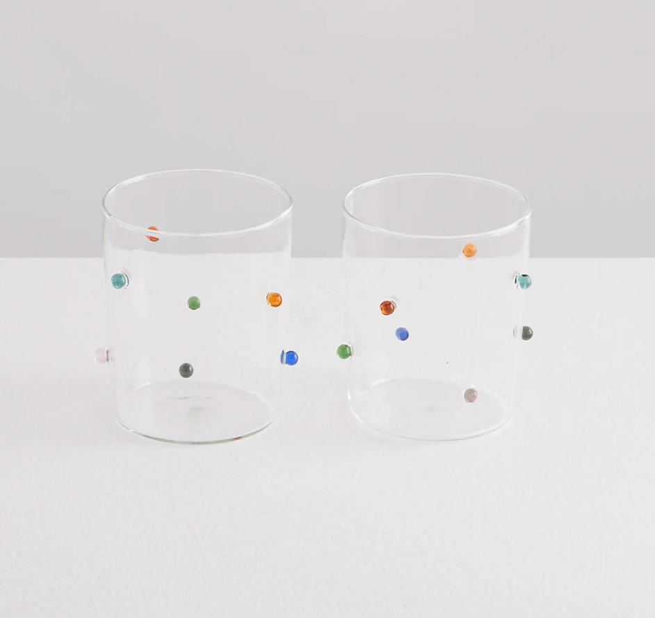 These two drinking tumblers are each handcrafted in clear borosilicate glass and adorned with floating glass balls. Each colourful pomponette playfully mimicks the effervescent dance of our favourite fizzy drinks as the bubbles leap to and fro.